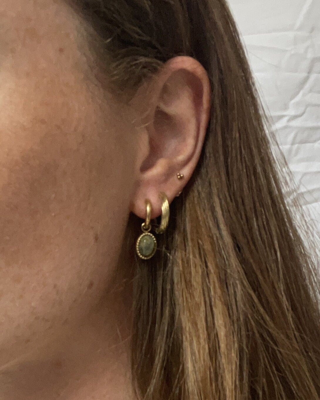 De Diana hoops met een ovale natuurstenen bedel hebben een tijdloze en rustige uitstraling. Gemaakt van stainless steel en perfect om elke dag te dragen of te combineren met andere oorbellen.