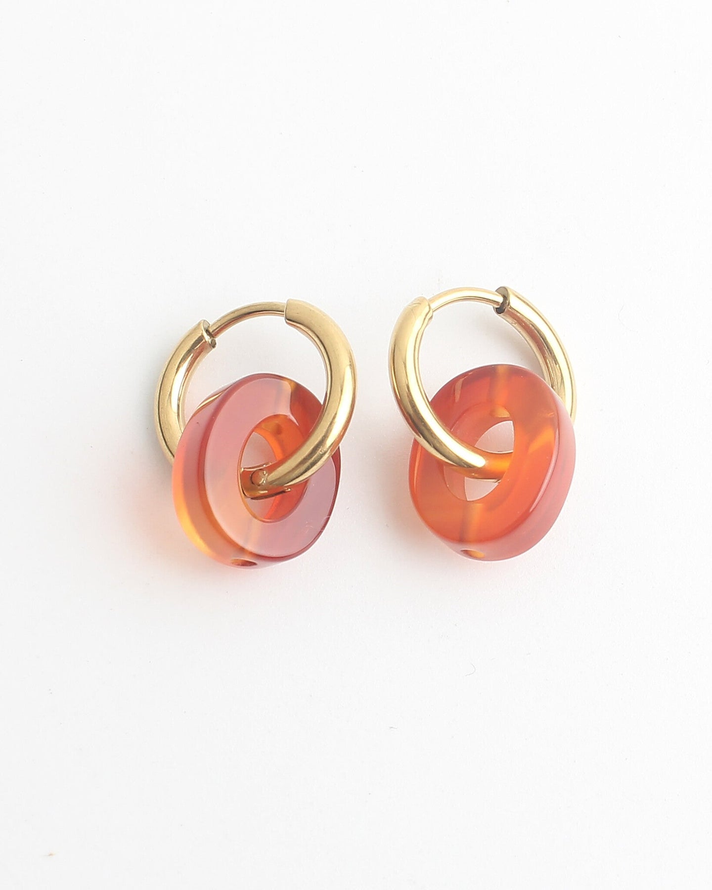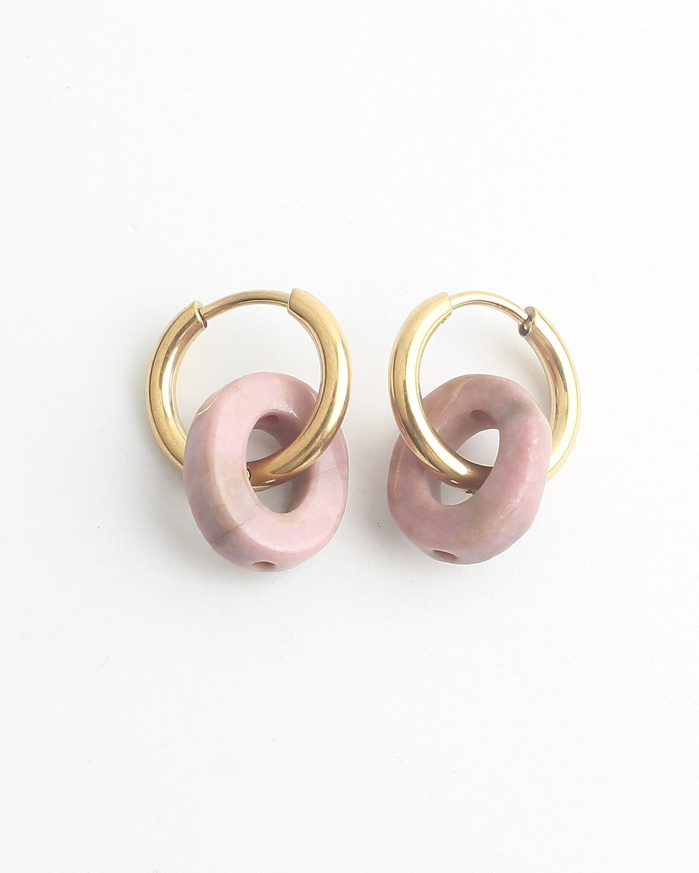 Deze oorbellen combineren een stijlvolle hoop met een cirkel van natuursteen voor een unieke, verfijnde uitstraling. Elke steen heeft zijn eigen kleur en karakter, waardoor geen paar hetzelfde is. Verkrijgbaar in verschillende steenkleuren.